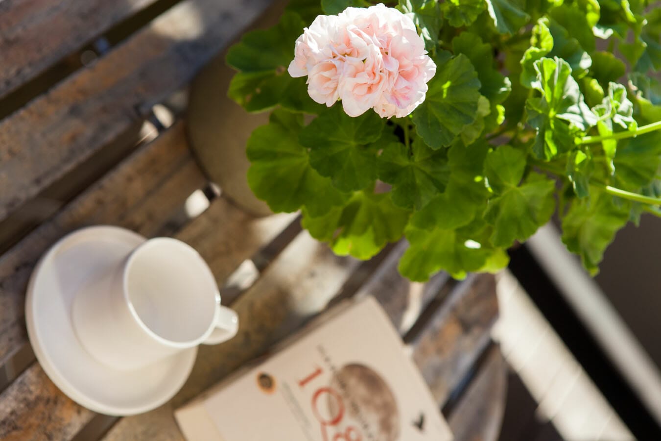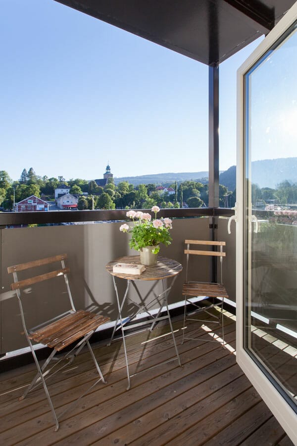 Fra balkongen kan man nyte den friske luften og lyden av fossen. Herfra har man også fin utsikt mot gamlebyen, Myntbrua, skogen og såklart fossen.